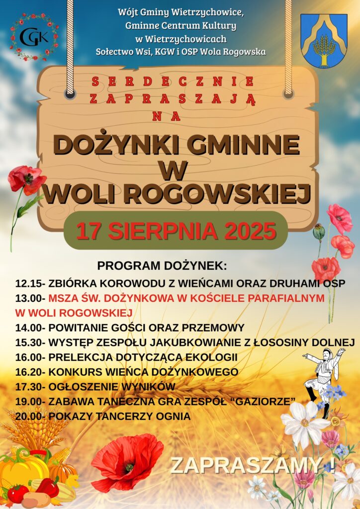 Serdecznie zapraszamy na Dożynki Gminne do miejscowości Wola Rogowska gmina Wietrzychowice dnia 17 sierpnia 2025r. Będzie super.