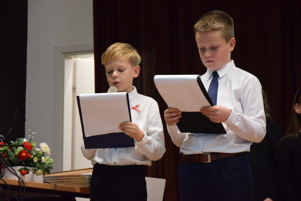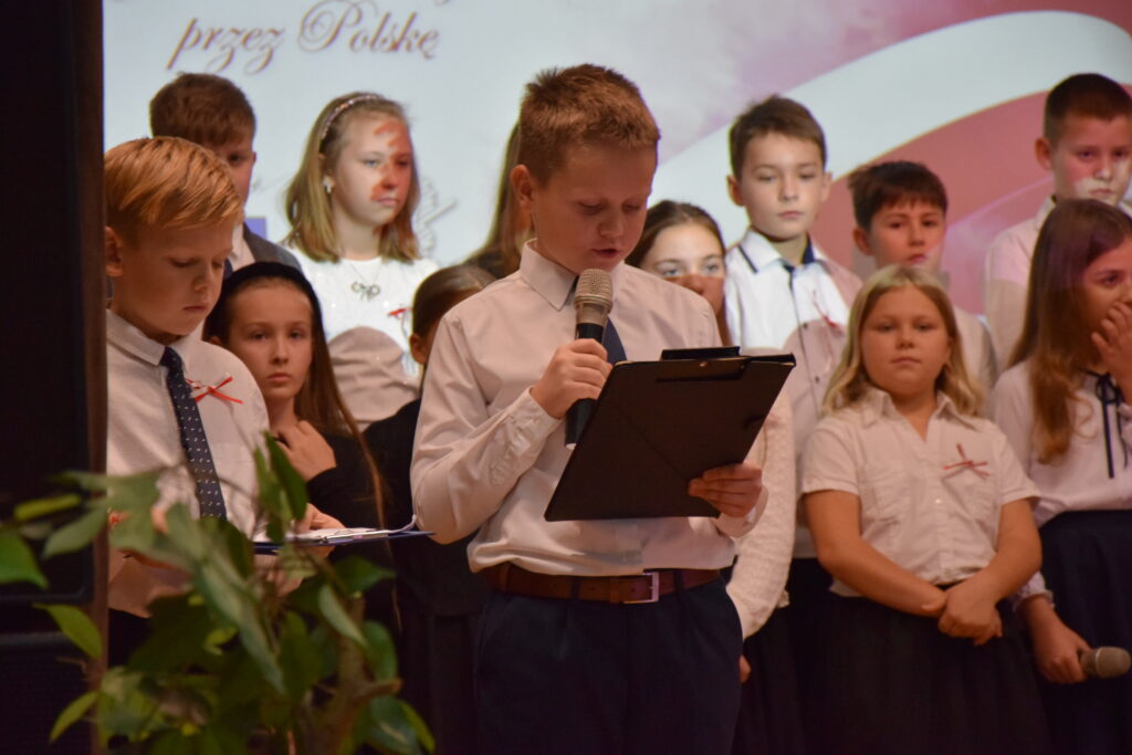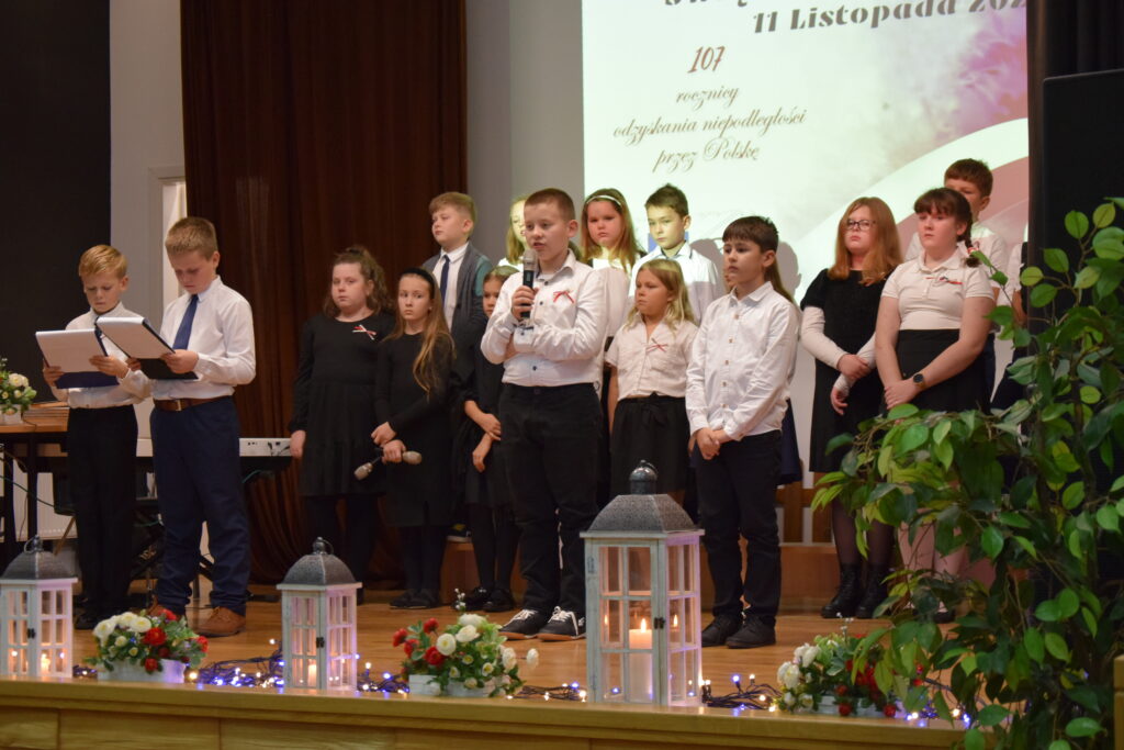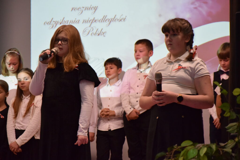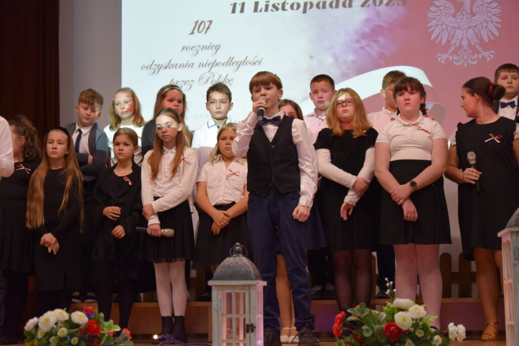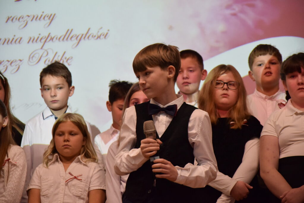 Następnie na scenie pojawili się utalentowani uczniowie klas IV, VI i VII z Zespołu Szkolno-Przedszkolnego w Wietrzychowicach. Wystawili oni wzruszający montaż słowno-muzyczny, przygotowany pod kierunkiem nauczyciela, Pana Mariusza Giży. Młodzi artyści w piękny sposób przybliżyli nam historię i ducha tamtych czasów.